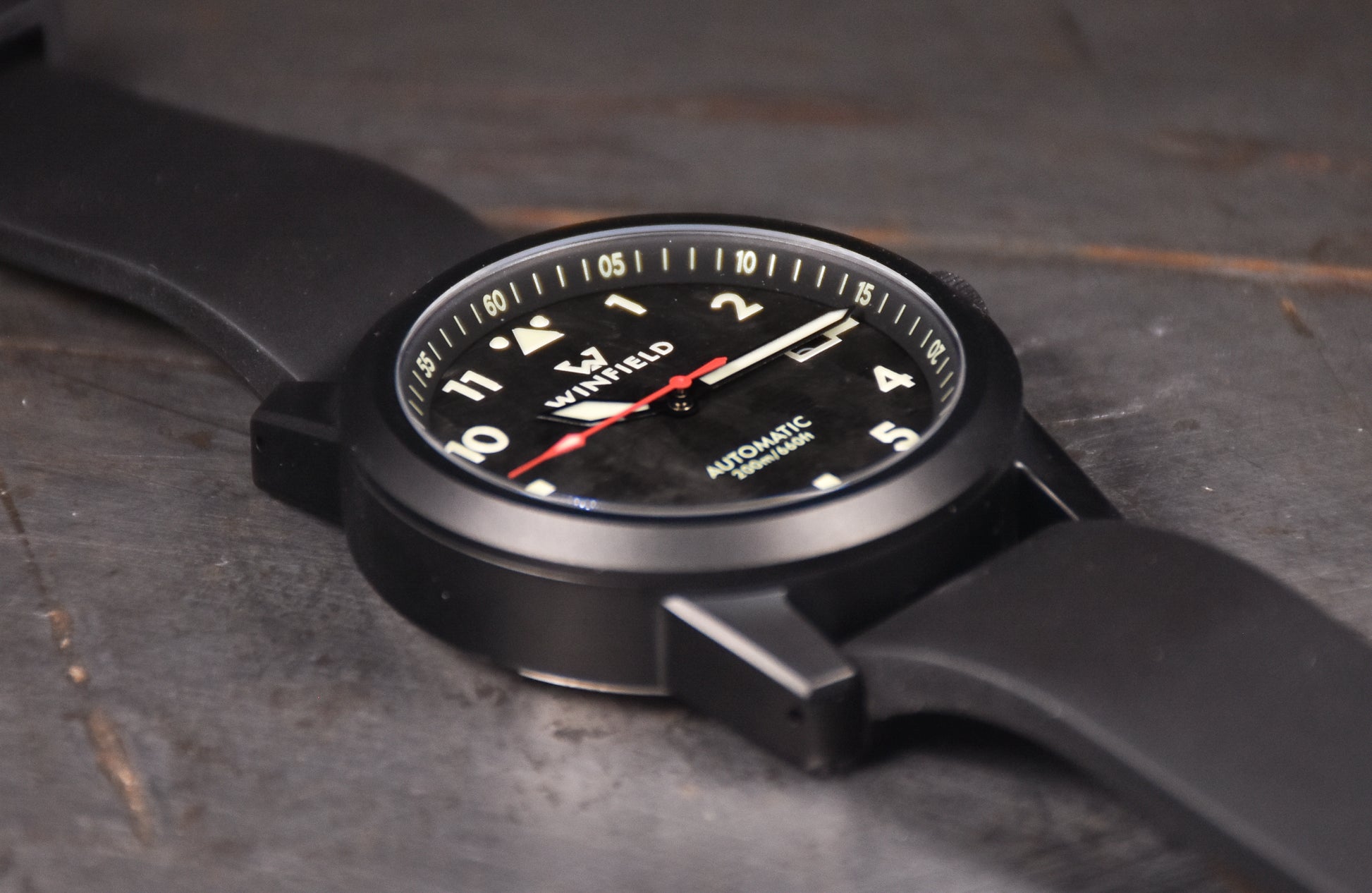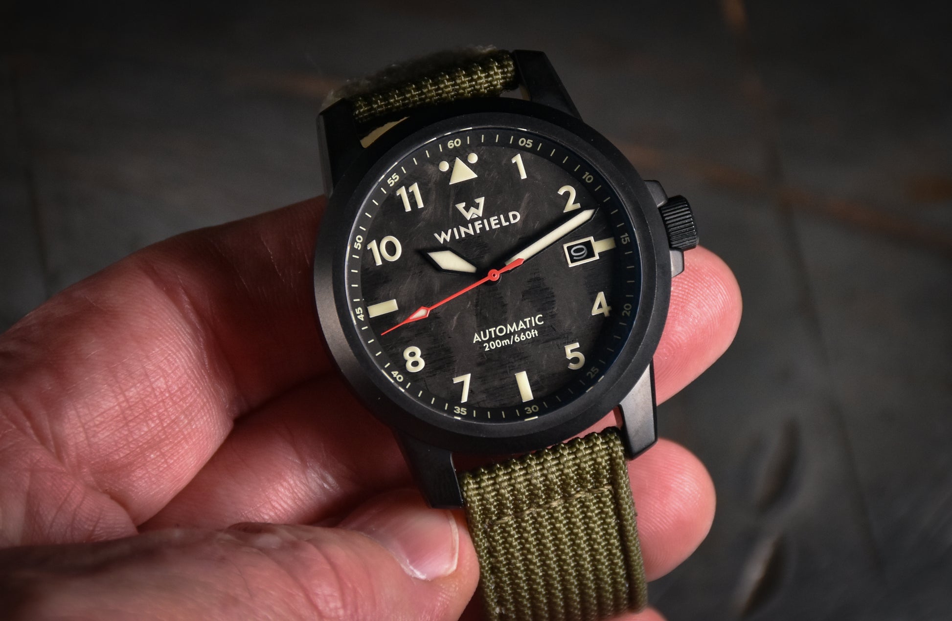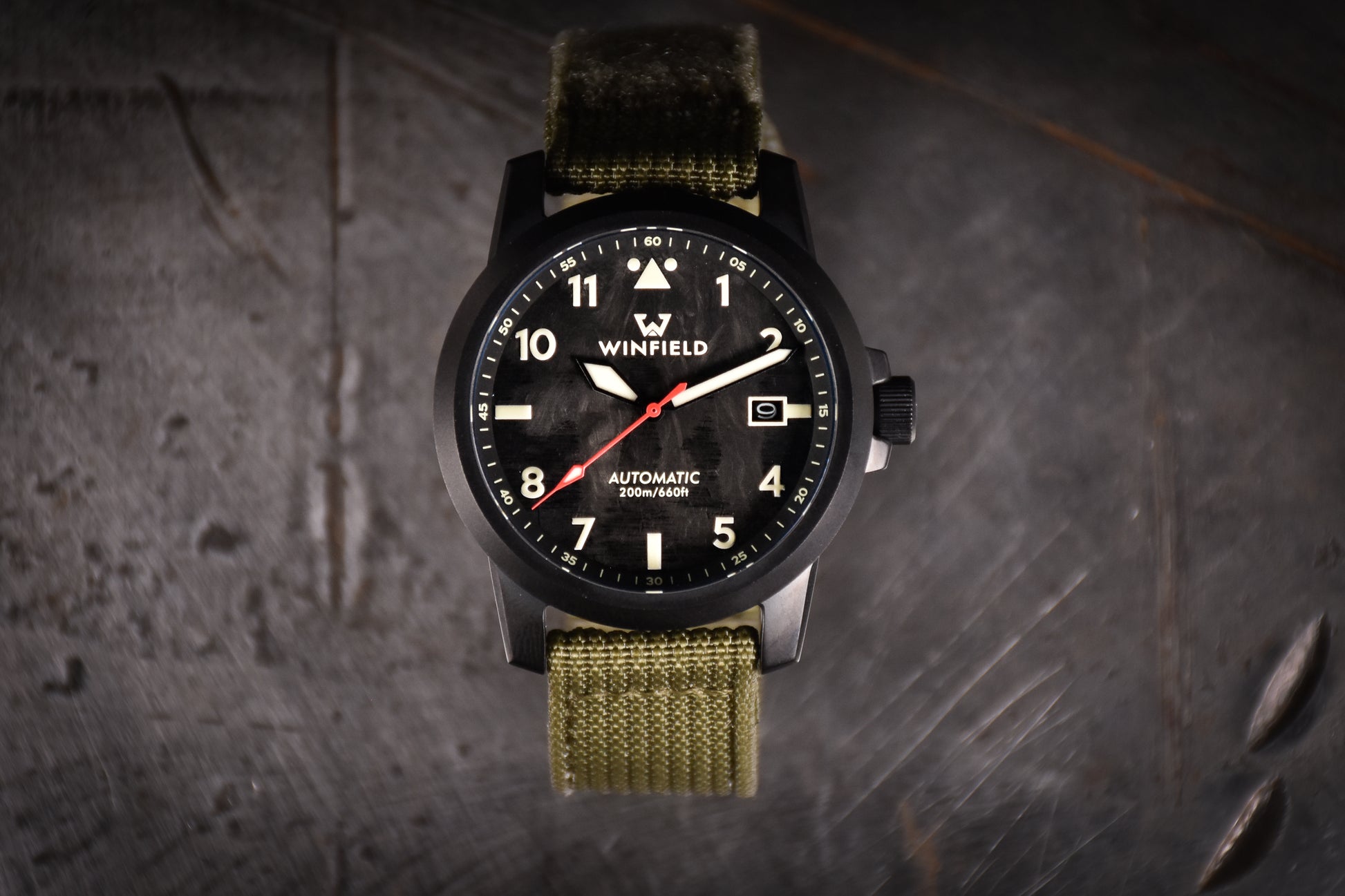 Standard load-out of the Winfield Carbon Lead COVERT is our new two piece black nylon strap with black hardware, our one piece nylon strap in OD green and a heavy-duty microfiber cloth all enclosed in our 12 ounce waxed canvas watch roll. A stainless warranty card will also be included.